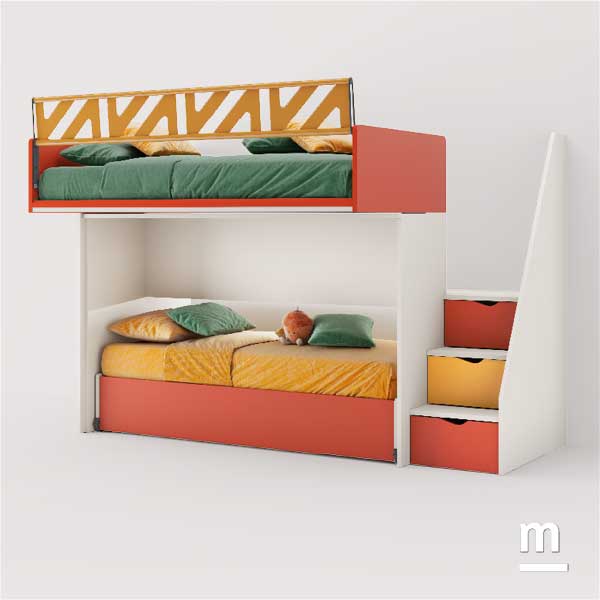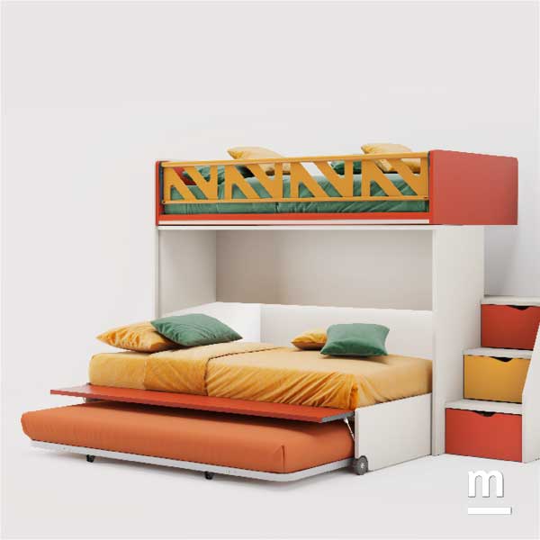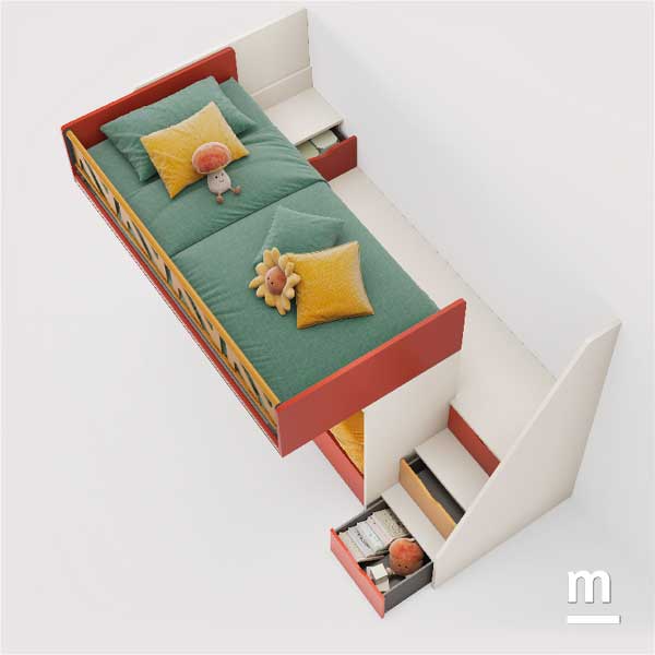 Il cuore del progetto è Level Smart, una soluzione compatta ma sorprendentemente capiente: sotto al letto inferiore si nasconde infatti un terzo letto estraibile, sempre pronto all’uso. Anche la scala non è una semplice salita al piano superiore: ogni gradino è un cassetto, una piccola “scatola segreta” dove riporre vestiti, giochi o piccoli tesori personali. È un ambiente che educa, stimola e accoglie. Un luogo dove i bambini possono crescere liberi di esprimersi, con la sicurezza che ogni cosa ha il suo spazio. E dove ogni giornata può iniziare con ordine… e con un tocco di meraviglia.