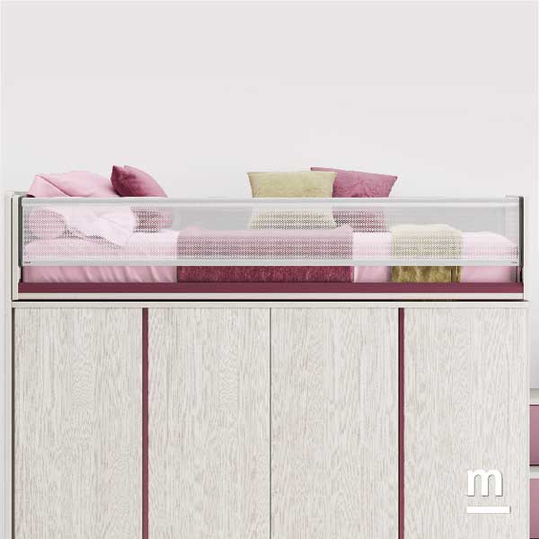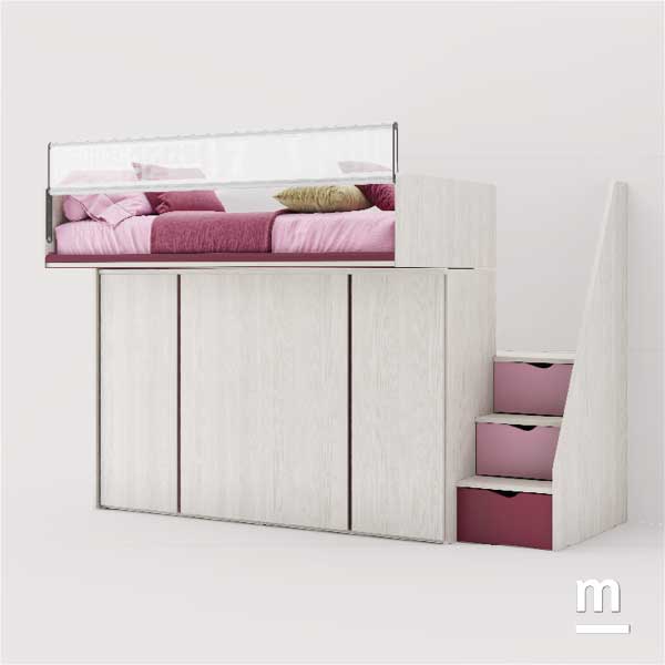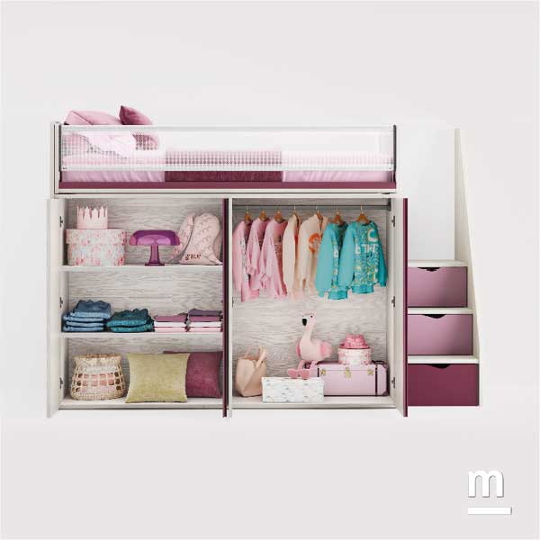 Il letto alto con pianale scorrevole di giorno si compatta lungo la parete, nascondendo la scaletta e lasciando libero il centro della stanza; la sera si trasforma, avanzando verso il centro per accedere facilmente al letto superiore. Una soluzione ingegnosa e sorprendente che, con l'immaginazione di un bambino, può diventare un’astronave, una torre o un nascondiglio segreto. Ma Level Smart è molto più di un letto, è una soluzione compatta progettata per sintetizzare tante funzioni insieme. In questo caso, sotto il letto superiore, si trova un armadio ampio e capiente. Due moduli chiusi da quattro ante permettono di organizzare con ordine abiti, giochi e oggetti personali, mantenendo lo spazio sempre in equilibrio tra libertà e praticità.