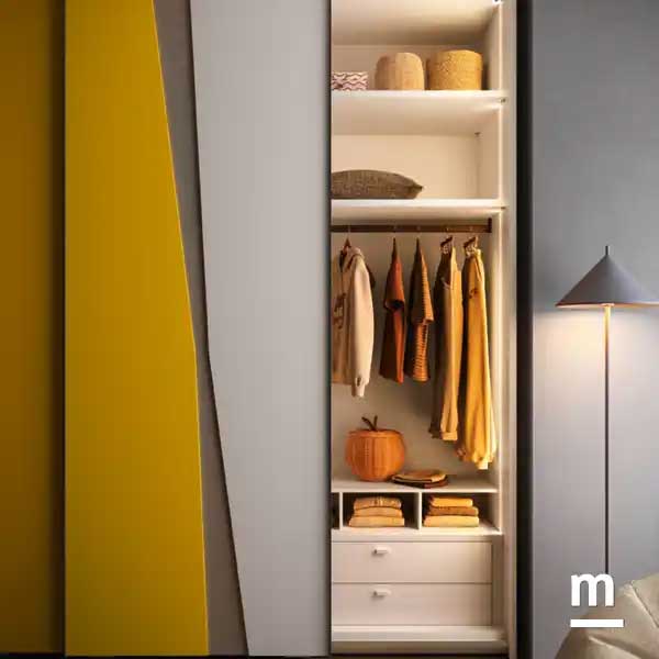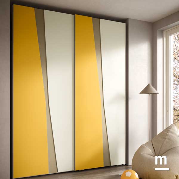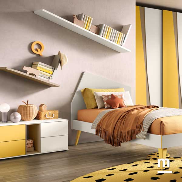 Cuore del progetto è il letto Iceberg, caratterizzato da una testata geometrica e pulita, reinterpretata con un tocco contemporaneo. Il giroletto Woody Slim in nobilitato bianco luce contrasta con i dettagli ocra dei supporti Duck e i profili di giunzione tra i longheroni. La zona notte si completa con una cassettiera bassa a doppia funzione, che serve anche da comodino, e con le mensole inclinate Warp, capaci di coniugare funzionalità e ironia grazie al loro disegno inclinato. Il ritmo visivo è dinamico, mai statico, in continua relazione con il mondo dell’infanzia. Anche l’armadio scorrevole Flake dialoga con questo linguaggio: le sue ante decorate da pannelli sovrapposti e tagli obliqui giocano con la luce e la profondità, dando vita a una superficie vibrante che richiama le linee delle mensole. Un dinamismo valorizzato anche dalle finiture in bianco luce, tortora e ocra.