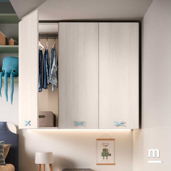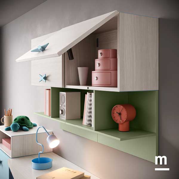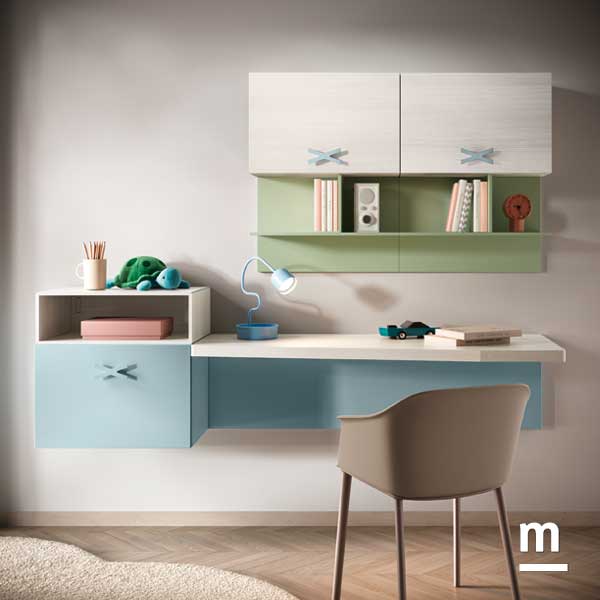 Un progetto che si distingue per la coerenza estetica, la leggerezza formale e la qualità del dettaglio, trasformando la cameretta in un angolo sospeso su misura, dove il design non è solo funzionale, ma anche profondamente evocativo. Accanto, un contenitore sospeso in essenza betulla, si articola in tre moduli verticali con ante a battente, decorati dalle maniglie Join laccate cielo. Al di sotto, una barra LED illumina la parete e il letto, creando un’atmosfera intima e accogliente. Il modulo contenitore basso con cassettoni funge anche da comodino. La zona studio completa lo spazio con equilibrio. Il piano scrivania sospeso, ampio e funzionale, si accompagna a una composizione di wallbox che alternano moduli aperti e chiusi, giocando con le finiture betulla e laccato menta. Sulla parete, una combinazione dinamica di Wallbox e Airbox crea un mosaico di pieni e vuoti, in dialogo costante tra ordine e creatività.