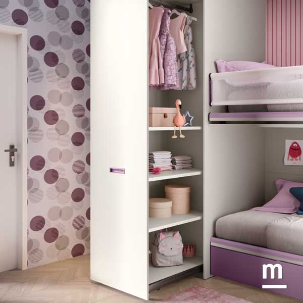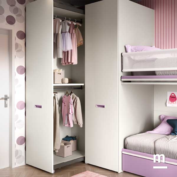 In questa cameretta, ogni elemento è pensato per ottimizzare gli spazi senza rinunciare al comfort e alla qualità estetica. Il cuore del progetto è rappresentato da una delle più interessanti novità della collezione: l’armadio estraibile. Una reinterpretazione dell’armadio tradizionale, particolarmente indicata in affiancamento ai letti o ai soppalchi, che grazie a moduli profondi 107 cm sviluppa uno spazio contenitivo particolarmente ampio. I carrelli interni scorrevoli — dotati di tubo appendiabiti o ripiani — permettono di portare all’esterno il contenuto del vano, rendendolo immediatamente visibile e accessibile. Una soluzione che combina efficienza e ordine con un gesto fluido.