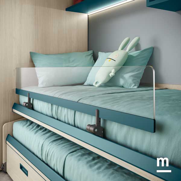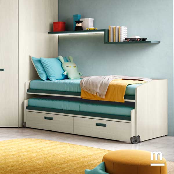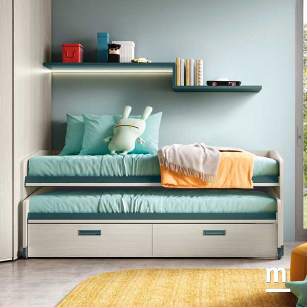 Il fulcro compositivo è la cabina armadio in essenza betulla, che diventa punto di snodo tra le due aree principali della stanza. Alla sua sinistra, un modulo libreria spezza la continuità dei volumi con leggerezza e introduce alla zona studio. Le finiture giocano con i colori complementari: ripiani in laccato pavone e schienale in ocra portano energia e personalità nello spazio. Sul lato opposto della cabina armadio, il protagonista è il letto Space Idea, che integra funzione di riposo e di contenimento in un unico volume compatto e dinamico. Il letto avanza verso il centro della stanza solo quando necessario, mantenendo libero il pavimento per il gioco e l’attività. Una mensola con profilo LED integrato illumina delicatamente la zona superiore, creando un angolo perfetto per la lettura serale.