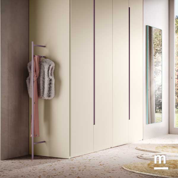 Anche l’armadio segue la stessa filosofia progettuale: una struttura essenziale, con dettagli pensati per fare la differenza. Le lunghe maniglie Rail laccate colore dalia aggiungono un tocco di carattere. A lato, l’appendiabiti a vista Parot svolge la doppia funzione di accessorio pratico e oggetto decorativo, perfetto per evitare il classico accumulo di vestiti sulla sedia. Soprattutto se la sedia in questione è Flap: un elemento dal design giocoso che merita di essere lasciato a vista.