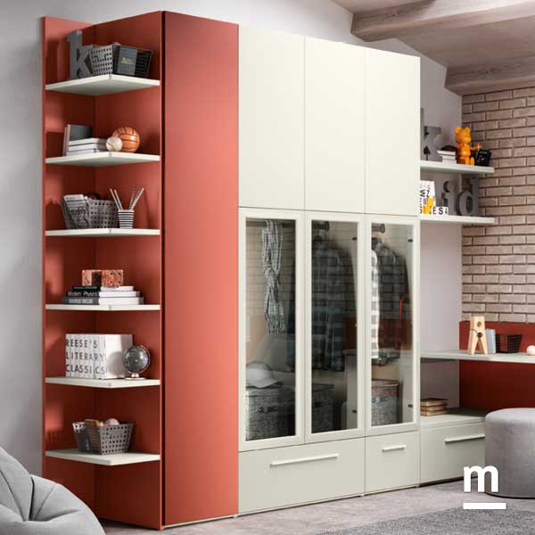 L’arredo si sviluppa in configurazione a L, sfruttando ogni centimetro con intelligenza. L’armadio battente in finitura quarzo domina la parete con le sue tre ante in vetro fumé, che lasciano intravedere – senza mai svelare – il contenuto: una soluzione attuale, sobria e versatile. Sul lato sinistro, il terminale Open rompe la simmetria e introduce un elemento dinamico in finitura corallo. Completa e personalizza l’armadio e può essere attrezzato con mensole (quattro o sei, per un armadio alto 258 cm) oppure con specchio e ganci appendiabito. Qui, semplici ripiani trasformano il modulo in una libreria a giorno, pronta ad accogliere oggetti personali, libri o accessori.