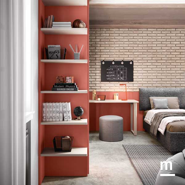 Dall’armadio, l’arredo prosegue naturalmente verso la parete adiacente, dove prende forma un angolo studio compatto ma completo. Bastano poco più di 170 cm per creare una zona operativa con scrivania, cassettone, mensole e una seduta cilindrica come il pouf Roll. Linee pulite, materiali pratici, colori ben dosati: tutto contribuisce a creare uno spazio che sa essere utile senza perdere carattere. A raccordare l’area studio con la zona notte è il pannello Wally, un elemento funzionale che arreda la parete e supporta il cuscino che funge da testata per il letto, il comodino, le mensole e – su richiesta – può essere dotato di un’illuminazione led discreta ma d’effetto. Appoggiato al pannello, il giroletto sommier imbottito aggiunge un tocco morbido e accogliente e può essere scelto anche in versione box per offrire spazio aggiuntivo di contenimento. Una cameretta compatta, energica, pronta a seguire ogni fase della crescita: qui ogni dettaglio parla di libertà, movimento e identità.