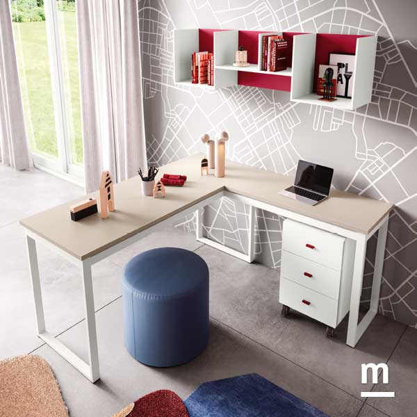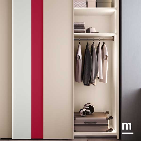 La parete di fondo è dominata da un armadio scorrevole che funziona come quinta visiva. Le ante Line, con la loro geometria discreta, movimentano la superficie grazie a un gioco calibrato di profondità. I toni scelti — bianco, tortora e laccato marsala — animano l’ambiente con un equilibrio tra sobrietà e energia, dando vita a un’estetica fresca e moderna. Pensata per accompagnare la crescita, la zona studio occupa l’angolo sinistro della stanza con una scrivania a L che può ospitare comodamente due postazioni: ideale per due fratelli o per condividere lo spazio con un amico durante i pomeriggi di compiti o attività creative. Una cassettiera su ruote aiuta a tenere tutto in ordine, mentre la composizione di wallbox a giorno offre un sistema funzionale per riporre libri, oggetti e materiali di uso quotidiano.