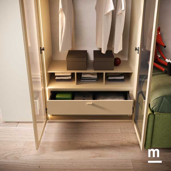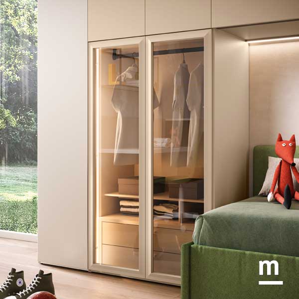 La composizione è costruita su una struttura salvaspazio, perfetta anche per stanze dalla metratura ridotta. L’armadio a ponte, in finitura quarzo e laccato crema, definisce l’architettura della stanza: sulla sinistra, tre moduli a terra offrono una zona guardaroba ben organizzata, perfetta per suddividere i capi per stagione o per uso quotidiano. All’interno, una cassettiera funzionale ospita la biancheria e gli indumenti più piccoli. Due ante in vetro finitura bronzo con telaio alleggeriscono la massa dell’armadio e lasciano intravedere l’ordine interno, valorizzato da una luce LED diffusa. Proseguendo verso destra, i moduli a ponte si sviluppano sopra il letto. Il profilo luminoso integrato regala una luce soffusa, ideale come fonte serale per leggere o rilassarsi, eliminando la necessità del tradizionale comodino.