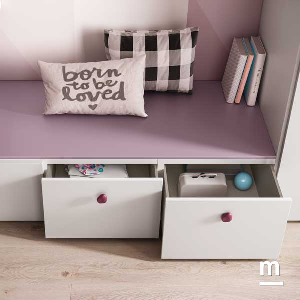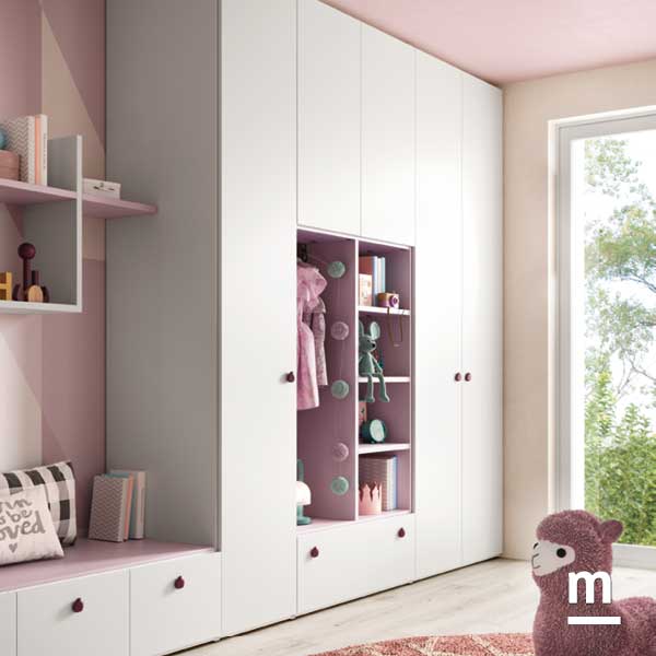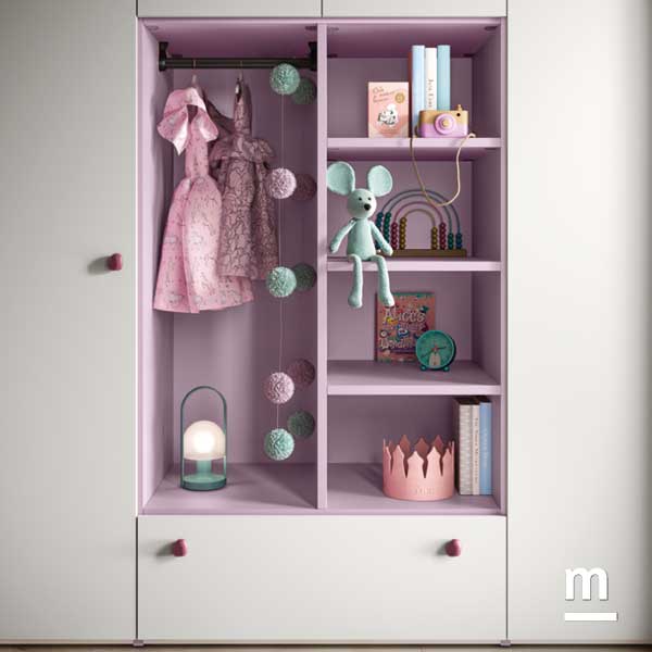 In questa composizione pensata per una bambina, il grande armadio in nobilitato bianco luce si impone come elemento centrale. A spezzarne visivamente la superficie, un vano a giorno in laccato dalia crea un punto focale acceso e funzionale: tre ripiani e un tubo appendiabiti lo rendono pratico, mentre il colore lo trasforma in una piccola area da personalizzare ogni giorno con giochi o libri. Sul lato sinistro, tre moduli bassi con cassetto mettono in connessione armadio e zona studio. Larghezza compatta per ogni modulo (45 cm) ma grande utilità: possono essere utilizzati sia per riporre i capi di abbigliamento piegati che per conservare il materiale per lo studio. Il top in dalia diventa un comodo piano d’appoggio per tenere a portata di mano quello che serve e, se serve, trasforma i moduli contenitori in una seduta.