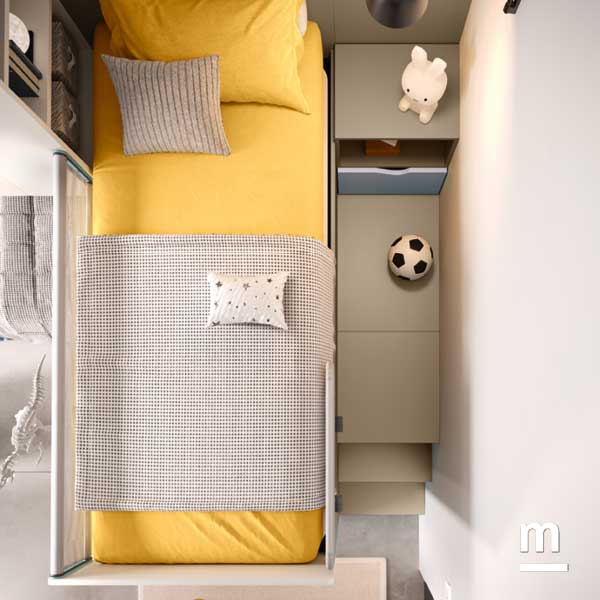 In questa composizione della collezione Moretti Compact Camerette, il soppalco Concept diventa un vero e proprio habitat dinamico pensato per rispondere con intelligenza a esigenze diverse, in un’unica struttura compatta e modulabile. I gradini della scala non sono solo un mezzo per raggiungere il letto superiore: ogni passo corrisponde a uno spazio in più per organizzare vestiti, libri o giochi. Il camminatoio posto sul retro semplifica il riordino e rende sicuro l’accesso, mentre il letto alto è equipaggiato con un comodino integrato e una libreria laterale, di fianco all’armadio a ponte, per avere tutto a portata di mano: dai peluche alle prime letture serali. L’armadio a ponte è sospeso a parete e non necessita si fianchi laterali di sostegno. Sotto, la zona notte continua con un divano letto posizionato in modo perpendicolare al soppalco che crea una configurazione dinamica e movimenta la composizione.