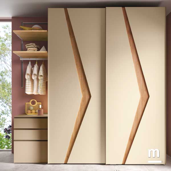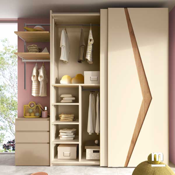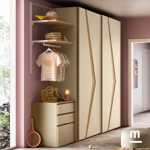 L’armadio è organizzato per semplificare la gestione del guardaroba fin da piccoli: una suddivisione interna che combina ripiani e tubi appendiabiti rende facile l’accesso e l’ordine. Ma è l’estetica delle ante Wing Smooth a catturare lo sguardo: una forma a freccia, creata dalla sovrapposizione di pannelli, aggiunge ritmo e profondità alla superficie, giocando con finiture tono su tono o in contrasto. Sul lato, un angolo ben sfruttato ospita un gruppo funzionale composto da cabina con montanti e un comò con due cassetti e un capiente cassettone. Uno spazio extra sempre utile — per la biancheria di stagione, per tutto ciò che serve ogni giorno, o per liberare il pavimento e lasciare più spazio al gioco.