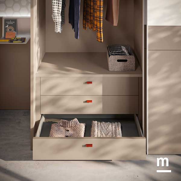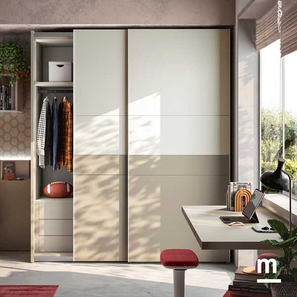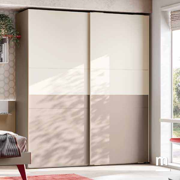 L’armadio scorrevole Strip ha le ante formate dall’unione di quattro pannelli di altezze e colori diversi che consentono di personalizzare i frontali in modo unico e personale. In questa proposta, l’abbinamento scelto mette insieme due finiture nobilitate: quarzo e tortora. Oltre ai nobilitati, è possibile creare accostamenti con i laccati per ottenere la soluzione originale perfetta.