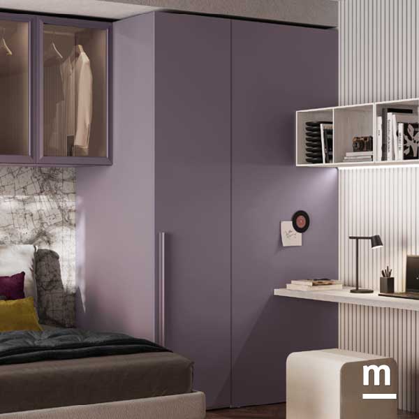 Nel cuore della stanza, la cabina armadio Long Square si sviluppa in verticale con discrezione. Una struttura compatta ma sorprendentemente capiente, dove tutto trova il suo posto: abiti, accessori, libri, sogni. Anche qui, la presenza è leggera, mai invasiva, pensata per accompagnare, non per ingombrare. Il dialogo tra le finiture gioca un ruolo centrale: i toni neutri del betulla vengono attraversati dai dettagli vibranti del mora, dando vita a un paesaggio visivo morbido, ma mai banale. Un luogo che evolve insieme a chi lo abita, pronto a cambiare forma come fanno le idee.