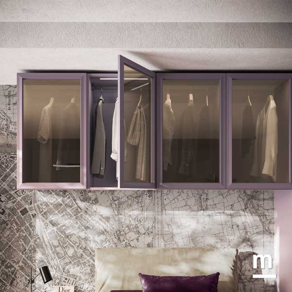 La zona notte è costruita attorno al concetto di sospensione, visiva e reale. Il letto Ginger, rivestito in ecopelle chiara, sembra fondersi con la parete alle sue spalle, creando un angolo intimo, raccolto, in cui ritrovarsi. A lato, il comodino formato da un wallbox senza maniglie completa un’immagine di quiete e leggerezza, priva di pesi superflui. Sopra il letto si sviluppa una composizione a ponte con wallbox vetrina laccati color mora: qui le ante in vetro bronzo lasciano intravedere l’interno: un gioco di trasparenze che regala ariosità alla stanza. La zona studio, invece, si sviluppa con naturalezza accanto alla cabina armadio, inserendosi tra volumi contenitivi e moduli a giorno. Un piano scrivania sospeso si appoggia a una struttura composta da wallbox e mensole orizzontali che corrono lungo la parete. È uno spazio pensato per seguire il ritmo delle giornate: dallo studio alla creatività, dal silenzio alla concentrazione.
