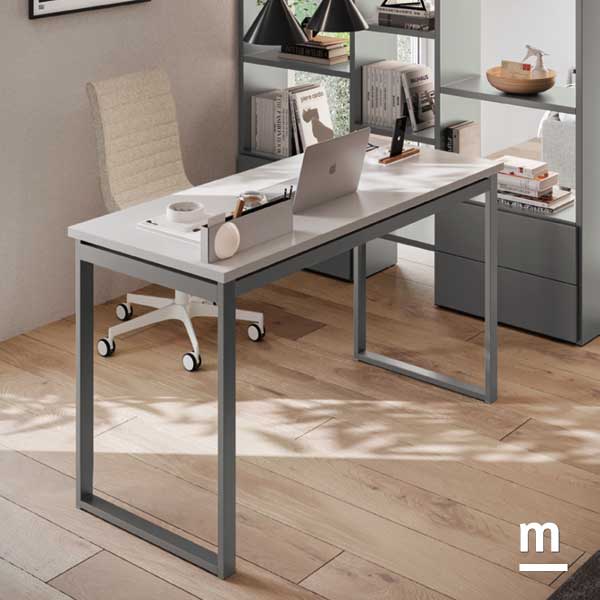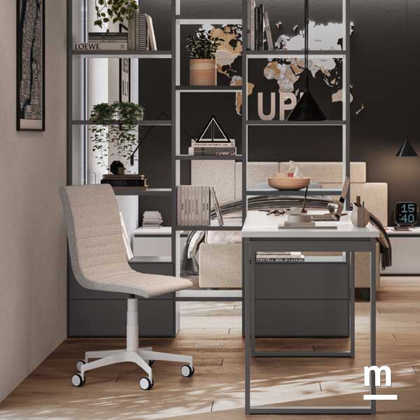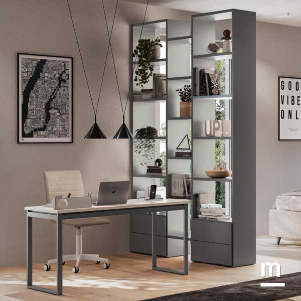 Elemento centrale nella definizione degli spazi è la libreria Outline bifacciale in finitura ardesia: alta e leggera, suddivide senza chiudere. È su questa soglia discreta che si affaccia la scrivania Fix, autoportante, dal profilo grafico e minimale. La struttura metallica, anch’essa in ardesia, dialoga con la libreria in un equilibrio di forme e colori.