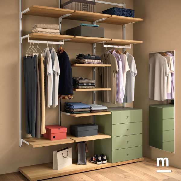 Dietro un portale in vetro, si apre la cabina armadio: ampia, attrezzata in base alle reali esigenze di chi abita la stanza, e pensata per adattarsi nel tempo. Ci sono cassetti, ripiani, appendiabiti, ma anche accessori più piccoli — organizer, scatole, custodie — per rendere il cambio stagione (e la quotidianità) meno caotici e più gestibili. Tutto qui si muove secondo un unico principio: massima componibilità. Nulla è fisso, tutto si adatta, si sposta, si trasforma. Perché crescere è un processo in continuo cambiamento, e lo spazio deve poter tenere il passo con creatività, leggerezza e quel tocco di razionalità che rende ogni incastro perfetto.