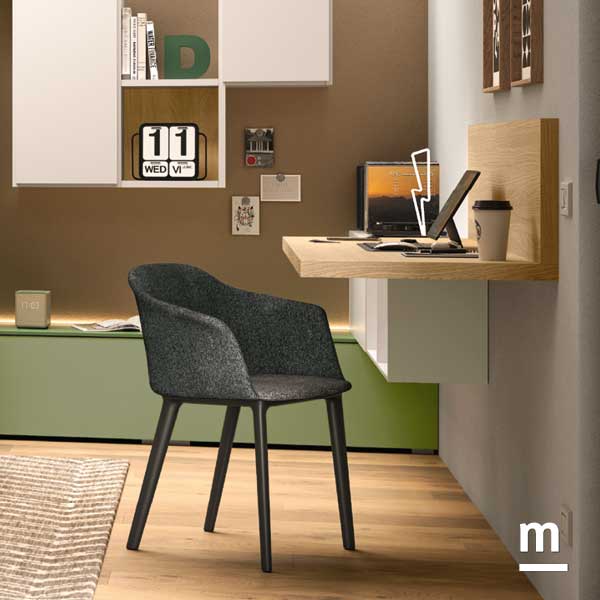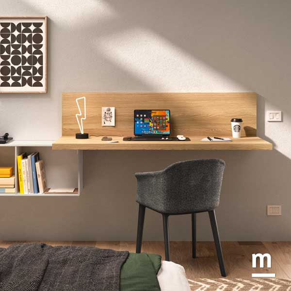 Il protagonista della stanza è un letto largo 130 cm, ampio e comodo, con testata imbottita Imperial e giroletto High Side dotato di box contenitore. Grazie alle ruote integrate, può essere spostato facilmente anche a pieno carico: piumoni, scatole e biancheria trovano spazio senza compromettere la praticità. Dietro al letto, i moduli wallbox laccati color flora hanno funzione di contenimento ed estetica allo stesso tempo. Collegate tra loro da un top coordinato, queste unità definiscono il passaggio dalla zona notte a quella studio, mantenendo coerenza visiva e leggerezza compositiva. La scrivania sospesa in essenza rovere è ancorata a moduli a giorno, perfetti per organizzare libri e materiali. E mentre tutto sembra essenziale e ordinato, la parete si anima grazie a un gioco di pieni e vuoti: wallbox aperti e chiusi disegnano un motivo grafico che rende il fondo del letto una vera scenografia urbana.
