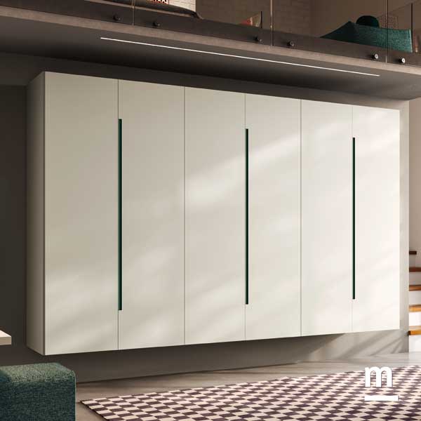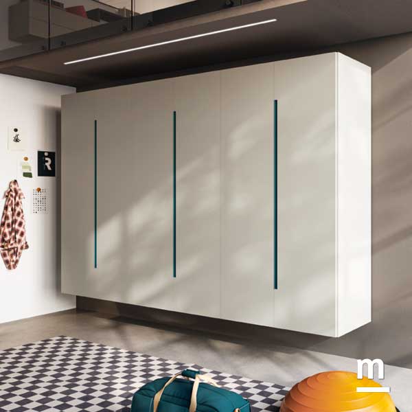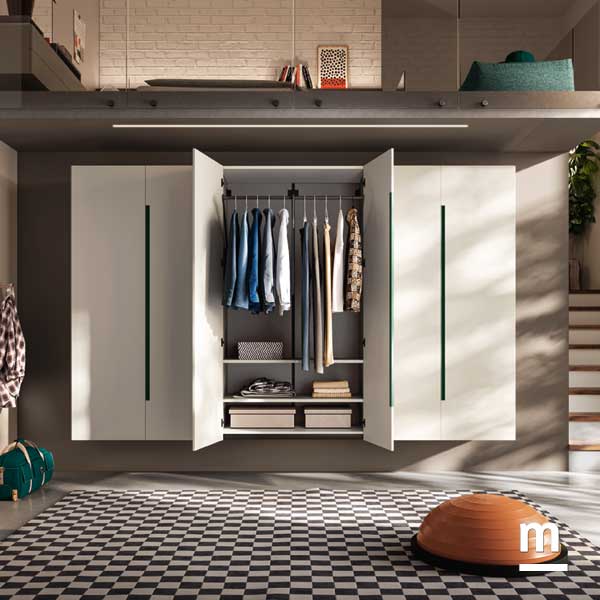 In questa composizione della collezione Young, l’armadio sospeso si inserisce al centro di una camera distribuita su due livelli, in cui zona notte e studio si alternano tra soppalco e piano inferiore, ognuno con la propria funzione, ognuno con il proprio respiro. Qui l’armadio Fly diventa il vero protagonista: le ante battenti in finitura quarzo, interrotte dalle maniglie Rail laccate pavone, disegnano un pattern ritmico e inaspettato. Ogni dettaglio — anche quello funzionale — contribuisce al carattere dell’ambiente. La parte interna dell’armadio è pensata per accogliere tutto: abiti, biancheria, oggetti. La cassettiera integrata scompare alla vista, ma rende immediata l’organizzazione. Tutto trova posto, con ordine e semplicità.