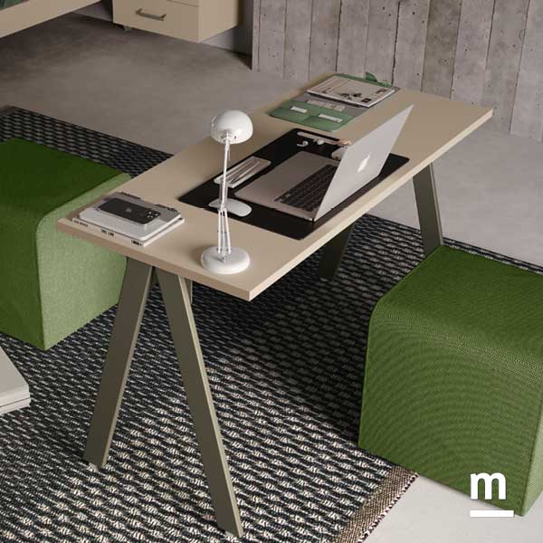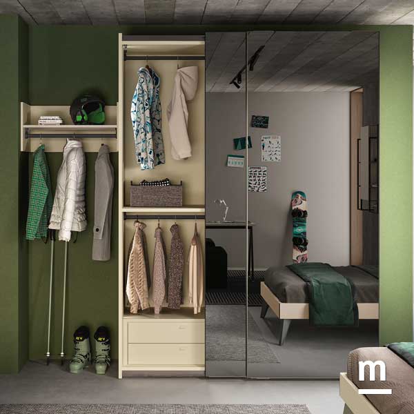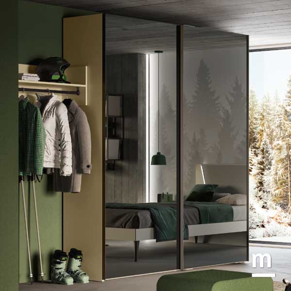 L’armadio scorrevole gioca con i riflessi: le ante a specchio grigio fumé dilatano lo spazio, riflettono la luce e portano una nota contemporanea al progetto. A fianco, il modulo Hatbox con appenderia a vista offre una soluzione rapida per abiti e giacche di tutti i giorni, con uno stile sobrio e diretto. Sulla stessa parete prende forma l’area studio: qui, un wallbox nobilitato crema, chiuso da anta, si combina agli Air Frame in tubolare di metallo formando una libreria moderna scandita da moduli di larghezze diverse. I profili in metallo, sottili e color pietra, accompagnano con discrezione la tonalità crema del pannello, in una palette che non stanca.