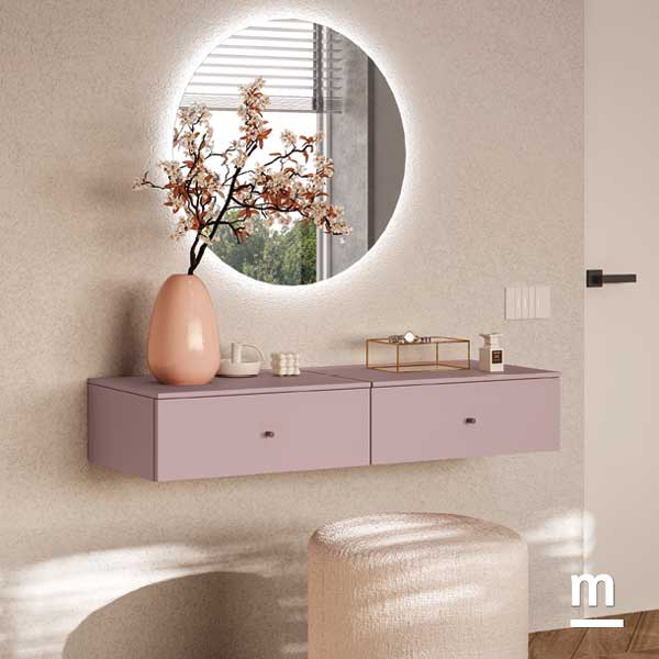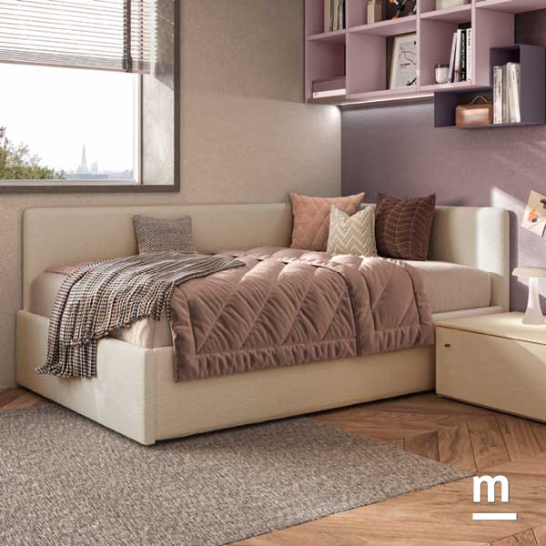 A terra, la libreria incontra un modulo basso che funge da comodino e collega visivamente la zona notte all’armadio battente. Le tre ante sottili verticali si vestono di frassino bianco e crema, due finiture che creano un contrasto delicato ma presente, che suggerisce equilibrio senza monotonia. Sotto la libreria, il divano letto crea un angolino accogliente e funzionale: è dotato infatti di box contenitore, in questa versione con apertura laterale (Box Side), utile per conservare la biancheria del letto o i capi più ingombranti. Il meccanismo idraulico facilita il sollevamento del materasso e lo rende più sicuro. Chiude la composizione un piccolo ma significativo angolo di libertà: una beauty station pensata per i momenti più personali. Due square box con cassetto e uno specchio rotondo retroilluminato bastano a creare uno spazio per sé, in cui prepararsi al mondo — o semplicemente osservarsi in silenzio.