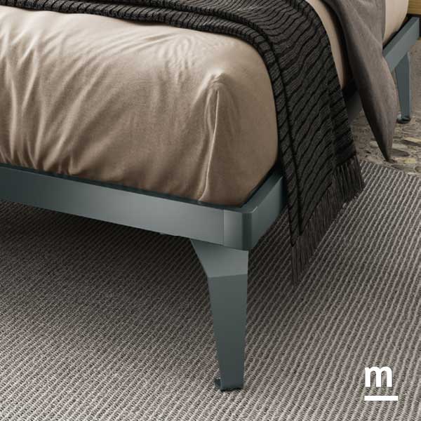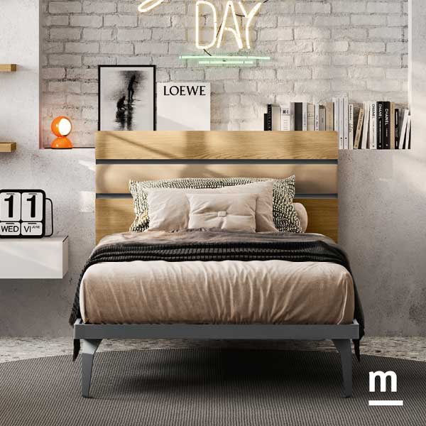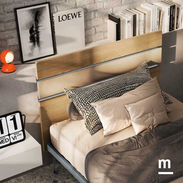 Il letto con struttura in metallo e testiera Row si presenta come una pausa visiva e tattile. I pannelli orizzontali, in finiture miste, alternano nobilitato rovere ed ecopelle dalla tonalità neutra. Un dettaglio pensato per il comfort, con la possibilità di inserire una strip LED nascosta per un’illuminazione più intima e diretta.