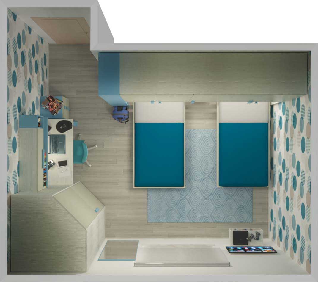 In questo caso la stanza non è molto piccola per cui l’indicazione del cliente di escludere le soluzioni a soppalco e a castello, non rappresenta un problema.