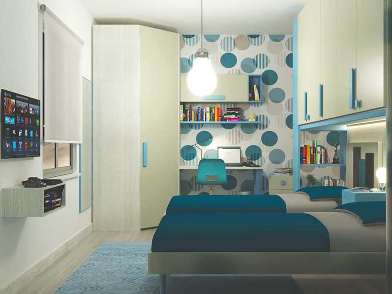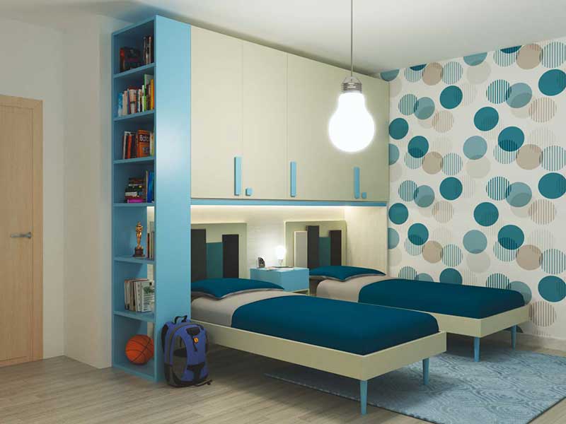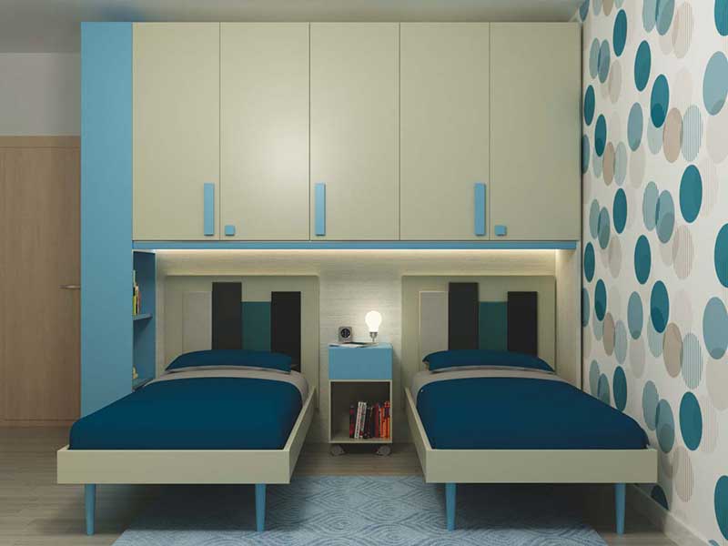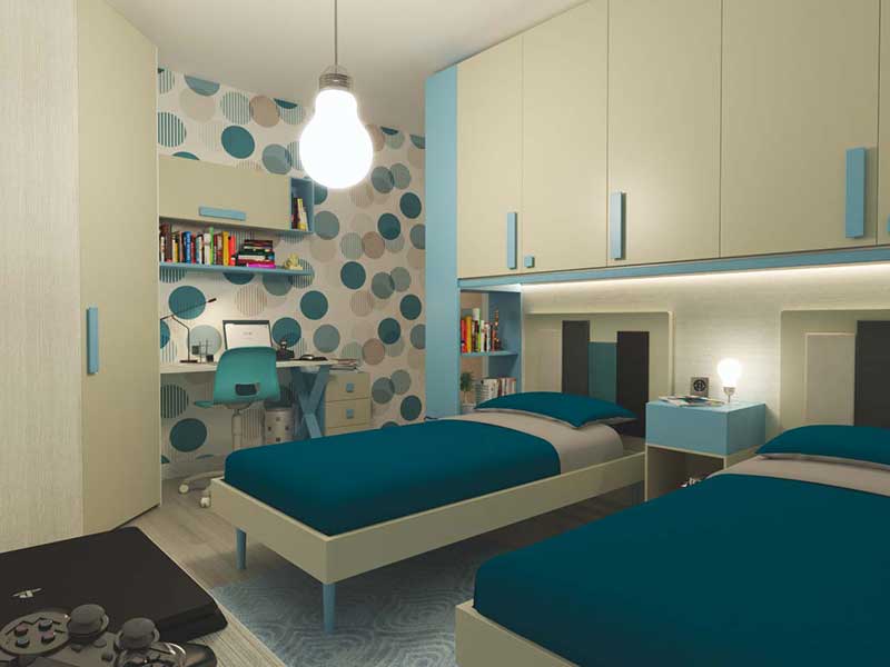 Tra i letti, un comodino wallbox servirà a entrambi i ragazzi per posizionare, ad esempio, la lampada e i libri per la lettura prima di addormentarsi.