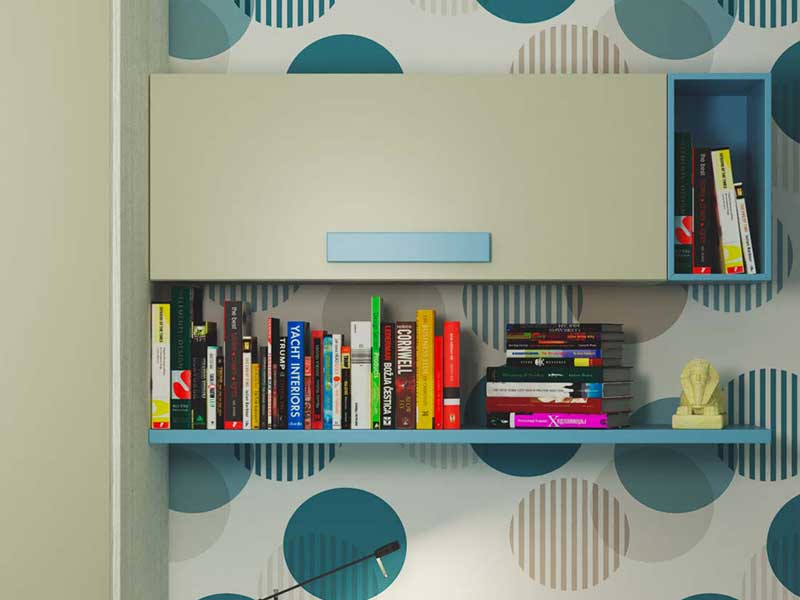 In questo caso, si è optato per un armadio a ponte con fianco libreria in modo da inglobare questo complemento fondamentale per riporre i libri e altri oggetti dei bambini nella stessa struttura dell’armadio, evitando così di occupare altro spazio prezioso.