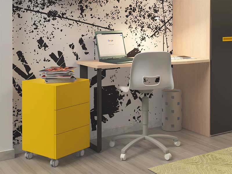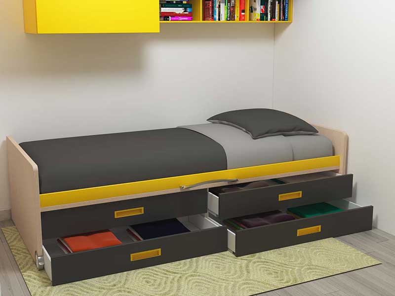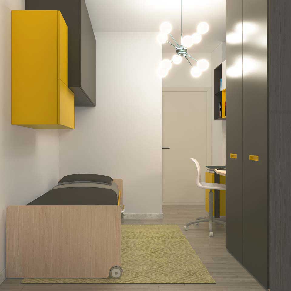Infatti, date le dimensioni molto ridotte della stanza che non consentono l’inserimento di una cassettiera, la soluzione proposta prevede un letto Space su ruote con 4 cassetti sotto il pianale.