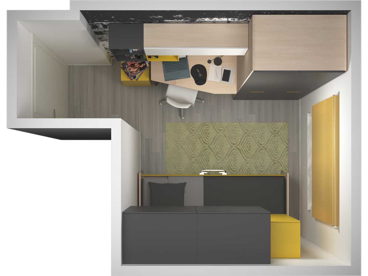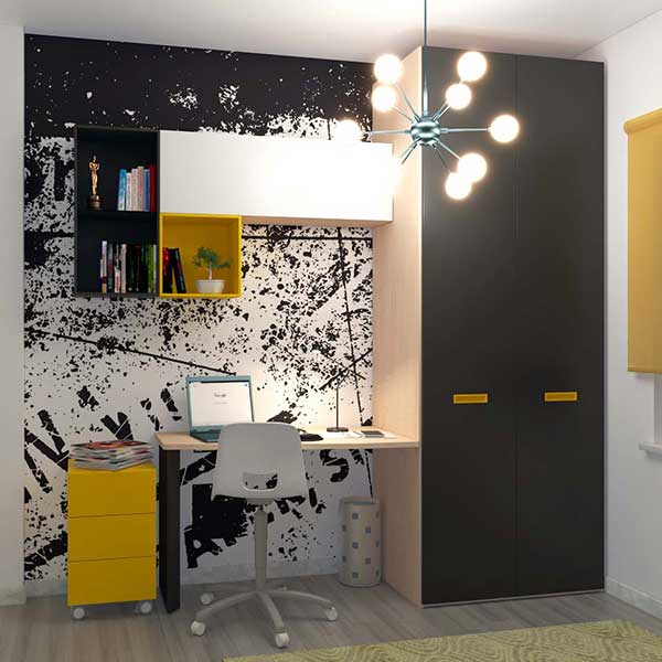 Lo spazio accanto all’armadio con ante battenti, è stato utilizzato per sistemare una scrivania con piano sagomato per ridurre la profondità in prossimità della porta d’ingresso alla stanza.