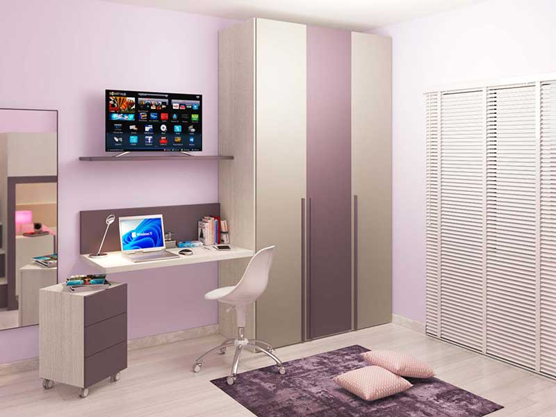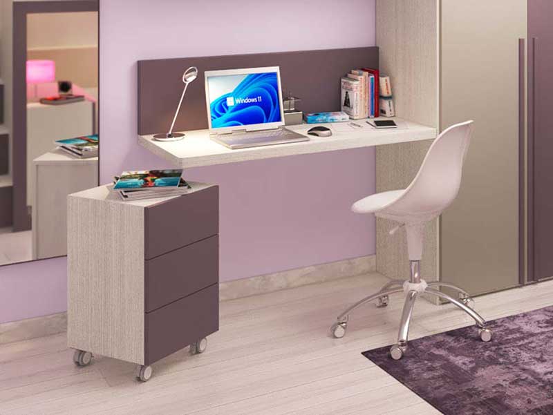 In questo caso, di fianco all’armadio battente trova posto una scrivania sospesa con cassettiera su ruote.