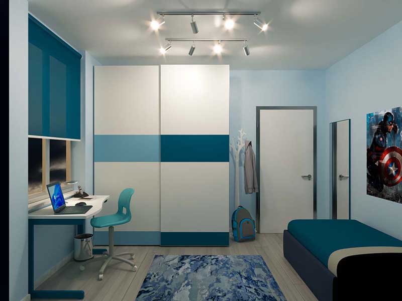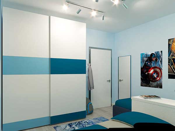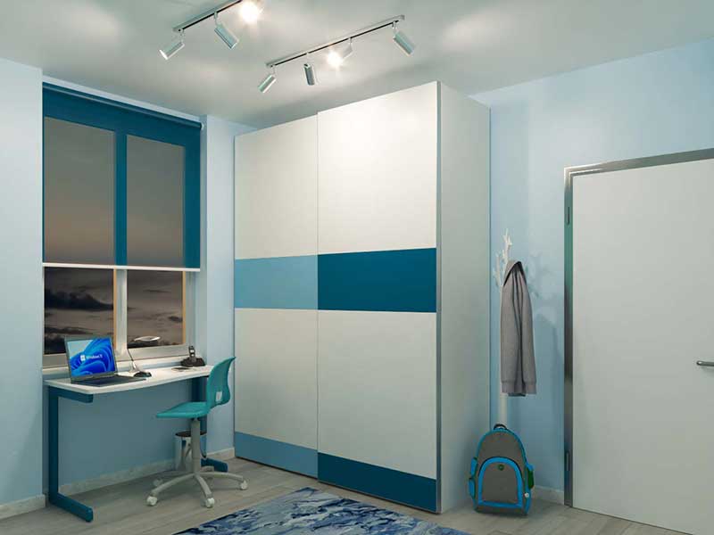 Trattandosi di una cameretta per due maschietti, per quanto riguarda la scelta cromatica, si è optato per la struttura in laminato frassino bianco con frontali laccati bianco, blu navy e cielo, tonalità che ritroviamo negli altri arredi e che risulteranno perfette anche quando i bambini diventeranno adolescenti.