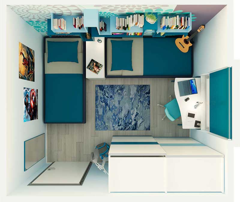 Le possibili idee salvaspazio sono molte ma, soprattutto se, come in questo caso, la richiesta del cliente è di una cameretta con due letti a terra (escludendo quindi, ad esempio, soluzioni a soppalco), la scelta deve essere ancora più oculata, per evitare di dar vita a un ambiente troppo chiuso e quasi claustrofobico.
