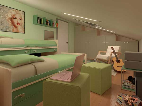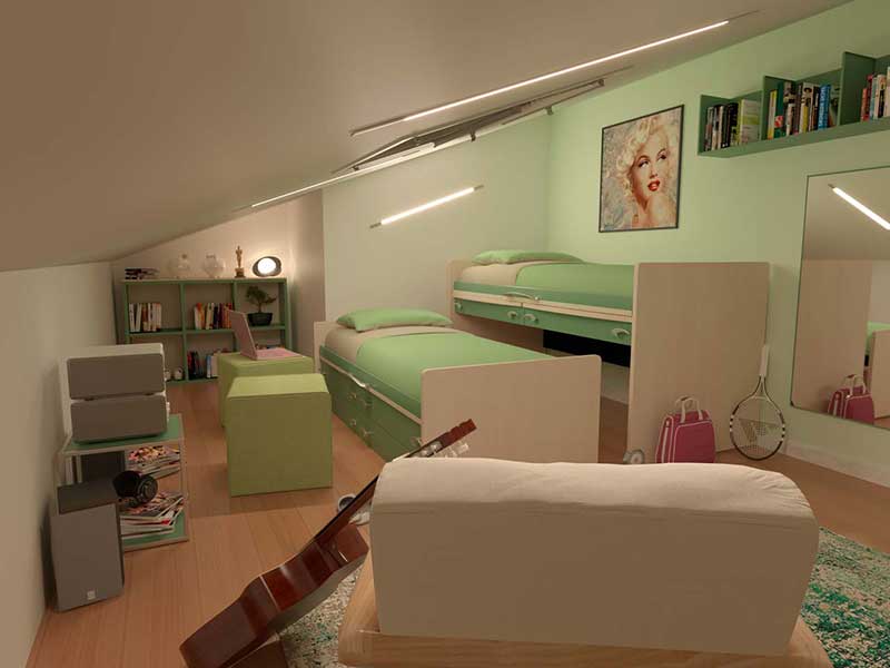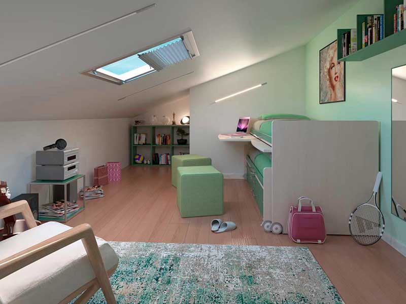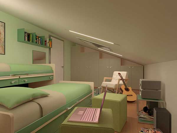 La scelta è stata dunque quella di sfruttare la parete più lunga, che si trova proprio nel sottotetto, per posizionare un sistema letto Space con due letti sovrapposti di cui quello inferiore estraibile.
