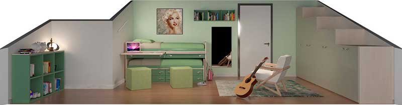 Per quanto riguarda il letto Space con scrivanie estraibili e cassetti ci siamo ispirati a questa composizione e a questa composizione, mentre per l’armadio abbiamo preso spunto da questo armadio mansardato su misura.