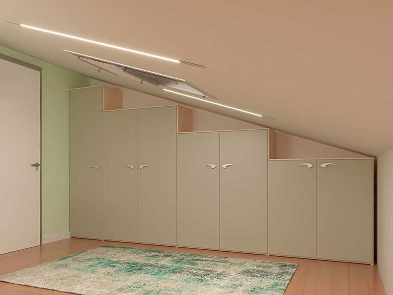 Quindi è stata progettata una armadiatura composta da moduli con ante battenti ad altezze diverse, assecondando la pendenza del tetto.