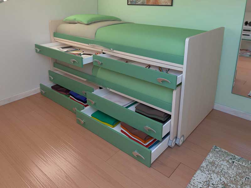 Inoltre, il sistema letto è dotato di numerosi cassetti che permettono di guadagnare ulteriore spazio contenitivo.