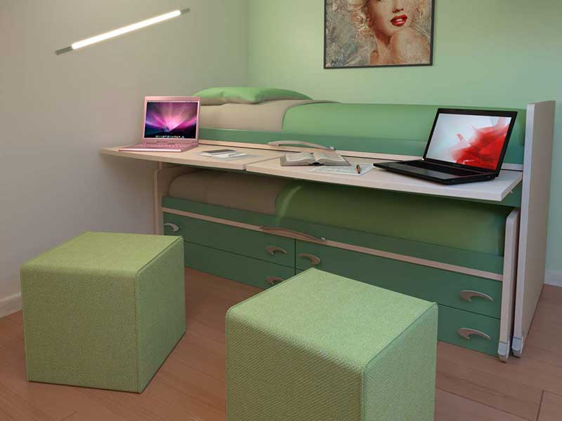 Il letto è infatti dotato di due scrivanie estraibili utilizzabili all’occorrenza e che “spariscono” quando non servono.