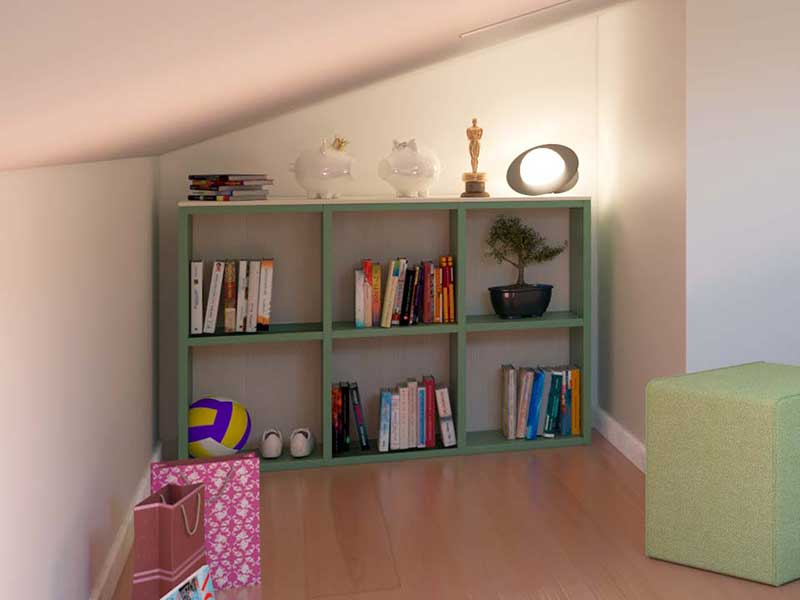 Per completare la zona studio, si è pensato di sfruttare anche l’angolo più basso della camera, andando a inserire una piccola libreria Outline, utile complemento per riporre i libri e i giochi dopo l’uso.