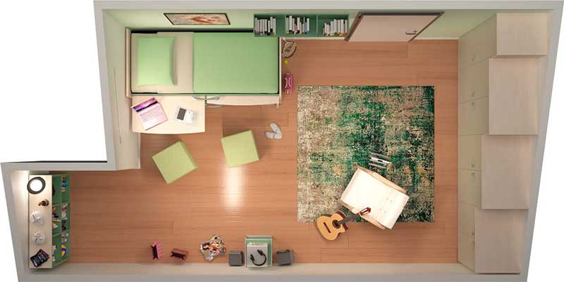 Combinando moduli standard di diverse dimensioni è stato possibile progettare una cameretta originale e personalizzata in base alle specifiche esigenze del cliente e alle caratteristiche del suo ambiente.